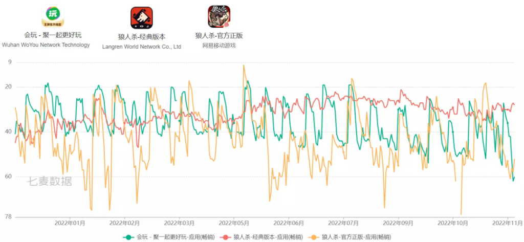 2018年初的《谁是卧底Online》改名为《会玩》,2019年末开始加大买量投入,应用也从那时候开始一直保持在iOS应用畅销榜的TOP100。